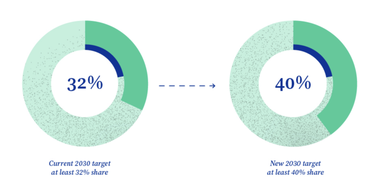 U rujnu 2023., EU je postavila novi cilj za udio obnovljivih izvora energije do 2030. godine. Sada planira doseći 42,5% udjela obnovljive energije, s mogućim povećanjem do 45%, umjesto dosadašnjeg cilja od 32%.
